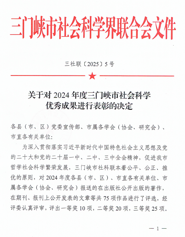 近日,三门峡市社会科学界联合会公布了《关于对2024年度三门峡市社会科学优秀成果进行表彰的决定》(三社联〔2025〕5号)。学院教师在此次评奖中表现突出,经市社科联组织专家严格评审,学院共有21项成果荣获各类奖项:一等奖2项,二等奖8项,三等奖11项,充分彰显了学院在哲学社会科学领域的研究实力。