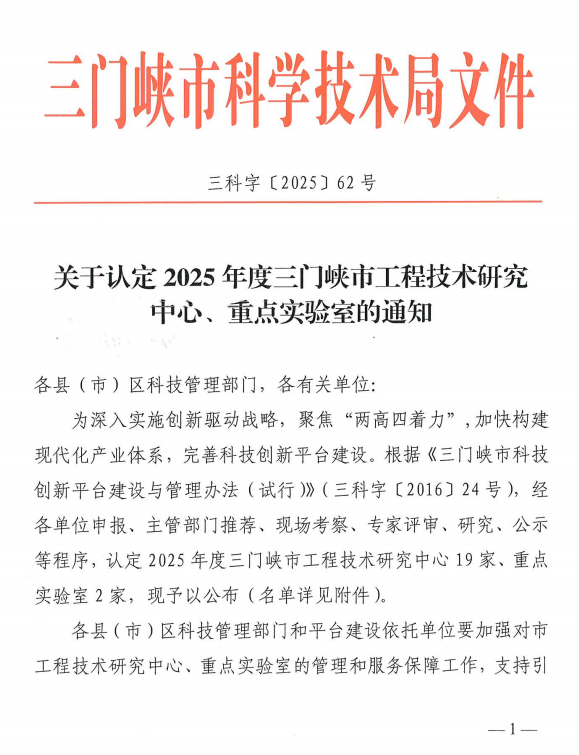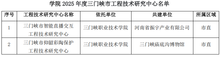 近日,三门峡市科技局发布《关于认定2025年度三门峡市工程技术研究中心、重点实验室的通知》(三科字〔2025〕62号),由学院组织申报的“三门峡市智能直播交互工程技术研究中心”和“三门峡市仰韶彩陶保护工程技术研究中心”获得认定。